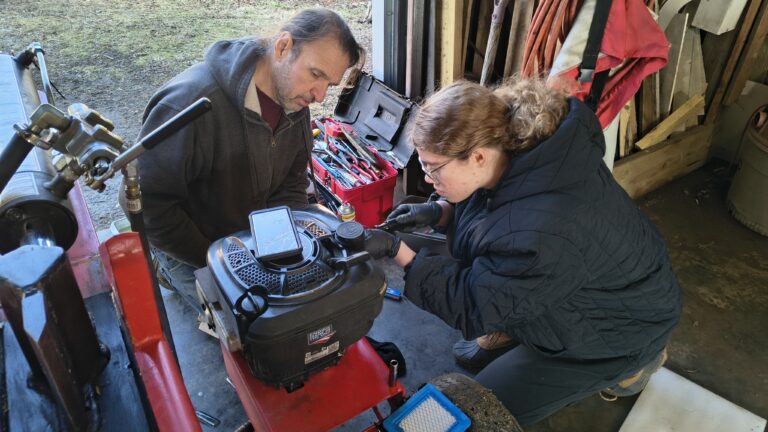 Everything on the farm is woven together so that one area of activity naturally integrates with and complements the others. Our firewood ministry, for example, has four log splitters. Two of them were out of commission and needed repair. This need became the perfect opportunity for a workshop. Our growing group of youth volunteers came together for a day of small-engine and hydraulics repair. Six young people from Lux Church in Jackson Ward joined us to repair and maintain all of our log splitters while learning a great deal about small engines. They received hands-on experience lovingly guided by two top-notch pros.